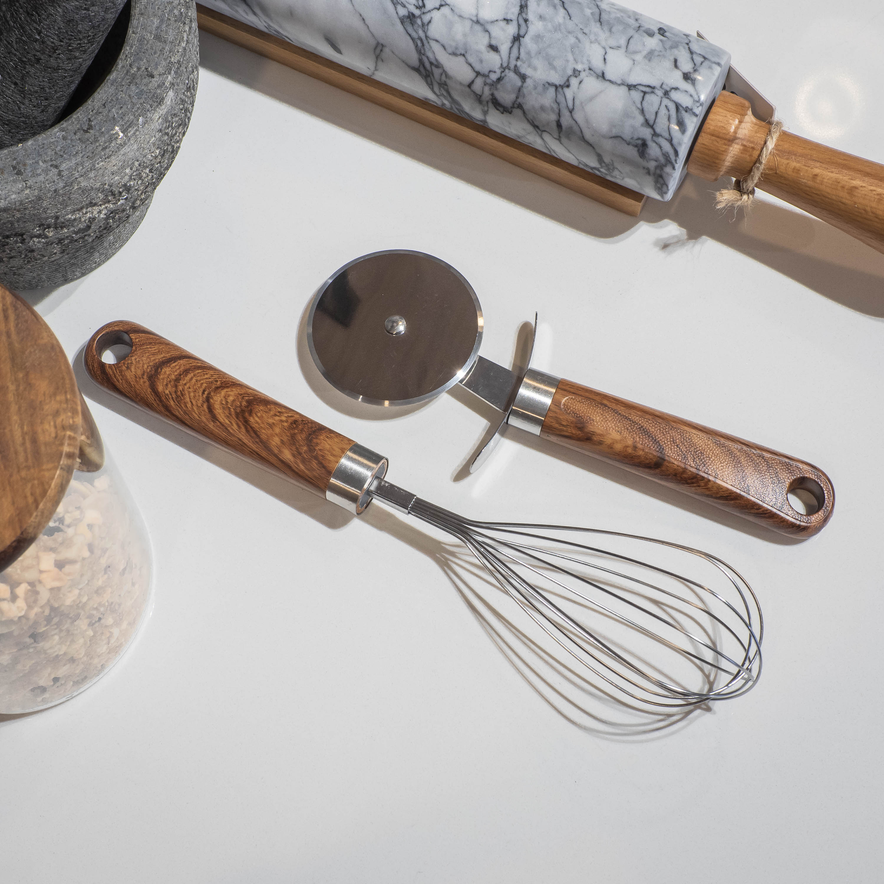 Los utensilios de cocina de madera y acero combinan la durabilidad del acero inoxidable con la suavidad y el confort de la madera. Estos utensilios ofrecen un agarre cómodo y ergonómico gracias a sus mangos de madera, mientras que las cabezas de acero proporcionan resistencia y facilidad de uso.