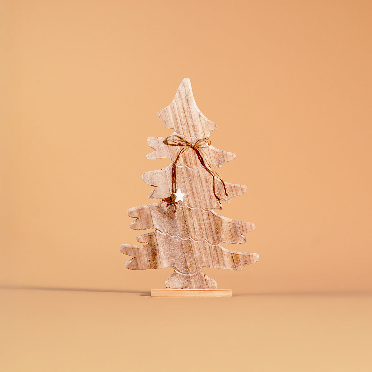 Adorno navideño en forma de árbol, elaborado en madera con acabado natural. Perfecto para decorar tu hogar con un estilo rústico y acogedor durante las fiestas.