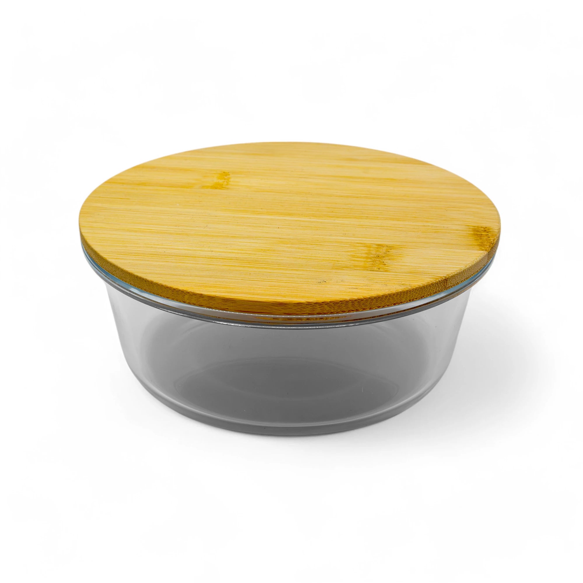 Taper de vidrio con tapa de bambú, perfecto para almacenar alimentos de manera segura y ecológica. Su cierre hermético conserva la frescura y calidad. Ideal para llevar o guardar en casa, combinando funcionalidad y estilo natural.
