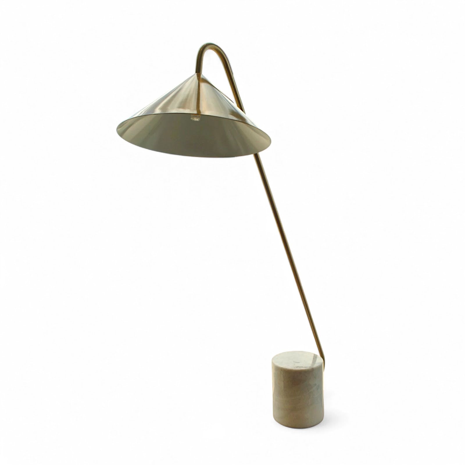 Moderno y minimalista, estructura de metal dorado y base de mármol. Ideal para ambientes elegantes y contemporáneos..