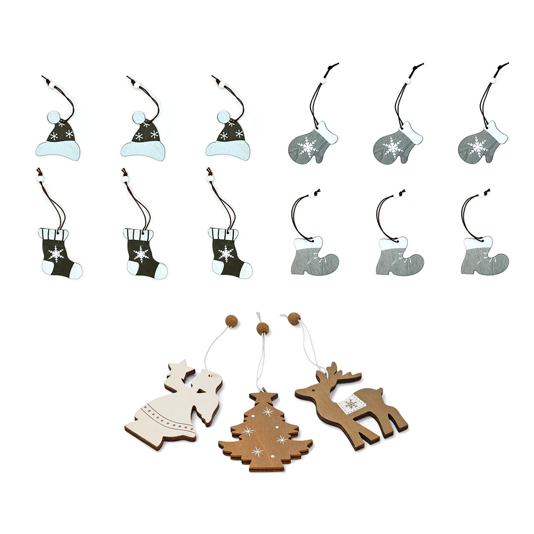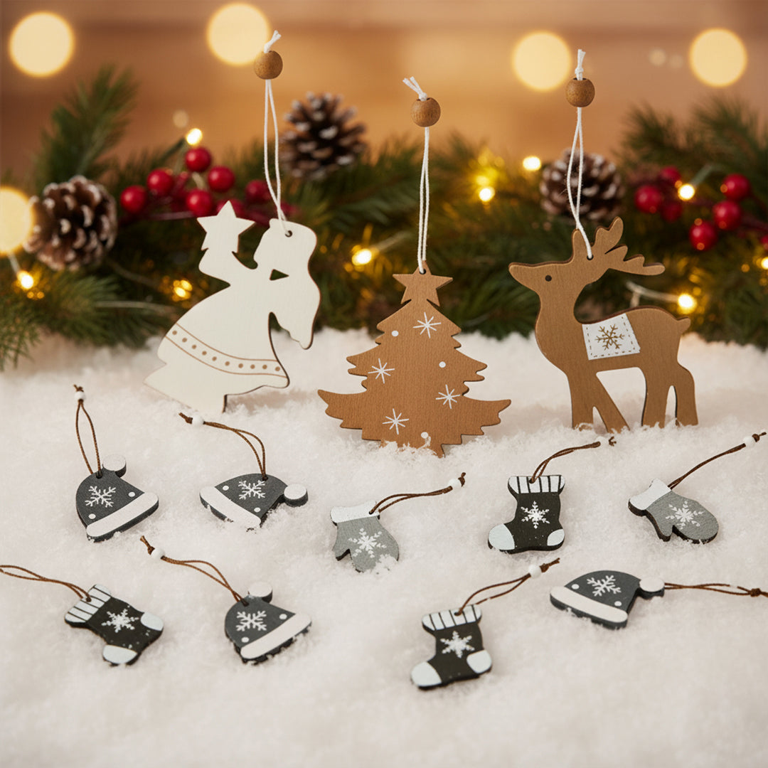 Kit de decoración navideña compuesto por colgantes de madera ideales para darle un toque cálido y artesanal a tu árbol de navidad, ventanas o espacios favoritos. Cada pieza combina tradición y estilo, aportando un detalle encantador a tu hogar durante las fiestas.