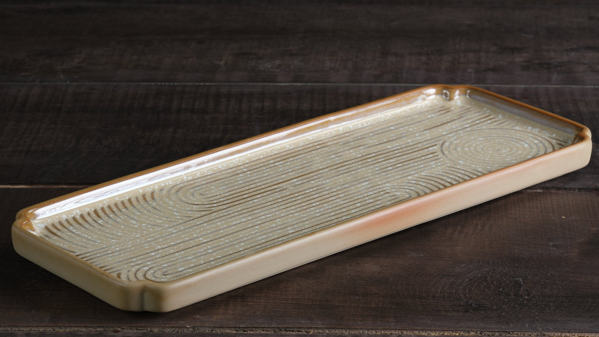 Plato rectangular de arcilla con un diseño artesanal en relieve, destacando patrones geométricos y un acabado rústico con detalles brillantes. Perfecto para decorar o servir con estilo y elegancia.