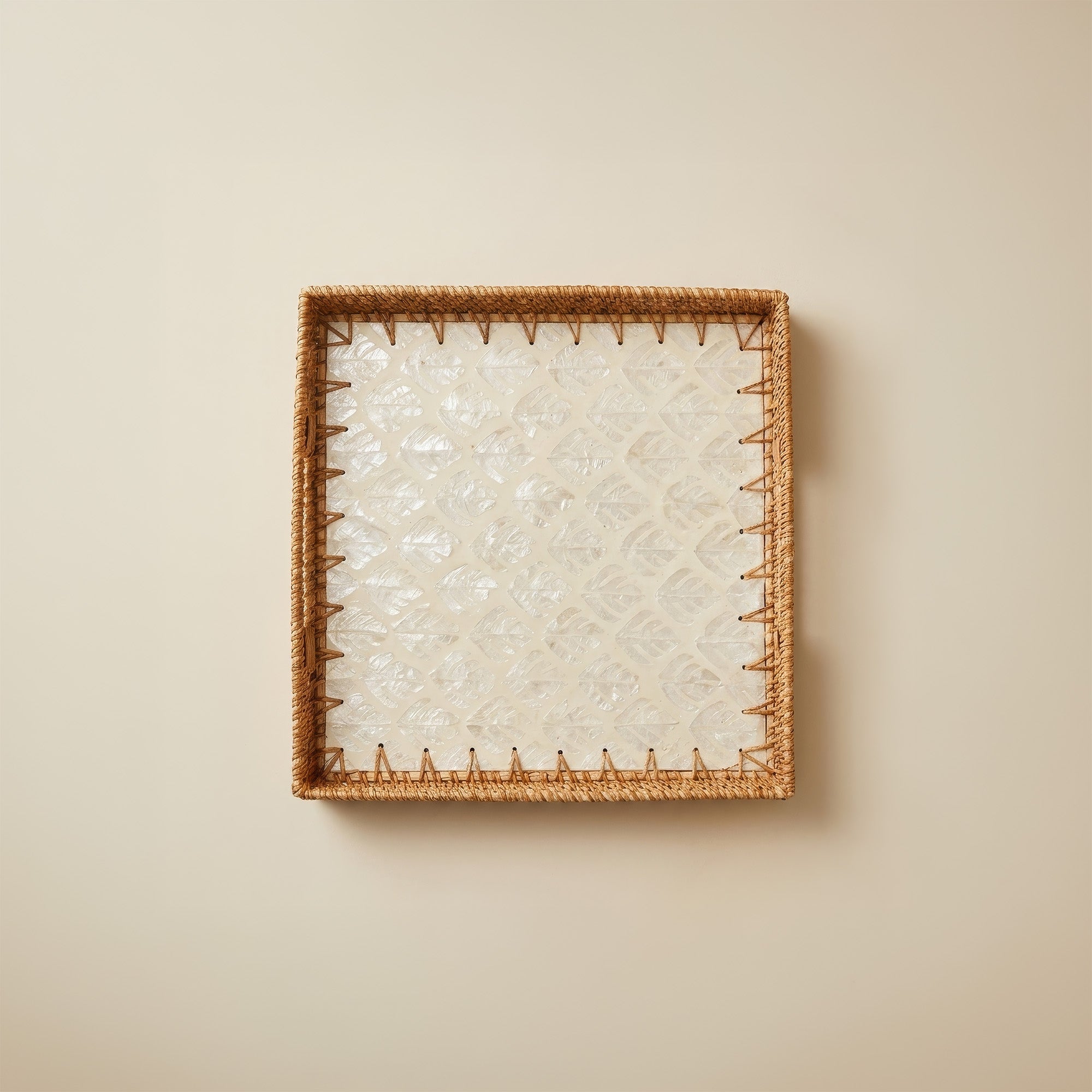 Bandeja cuadrada de rattán en tono natural, ideal para servir o decorar con un estilo cálido y natural. Perfecta para complementar cualquier espacio del hogar.