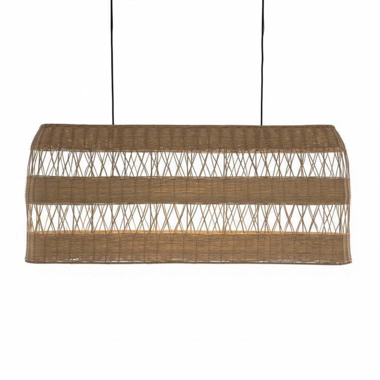 Lámpara colgante elaborada en ratán natural, con un diseño tejido que aporta calidez y textura a cualquier ambiente. Su estilo orgánico y atemporal permite una iluminación suave y acogedora, perfecta para destacar en comedores, livings o dormitorios. Ideal para complementar una decoración boho, rústica o mediterránea.