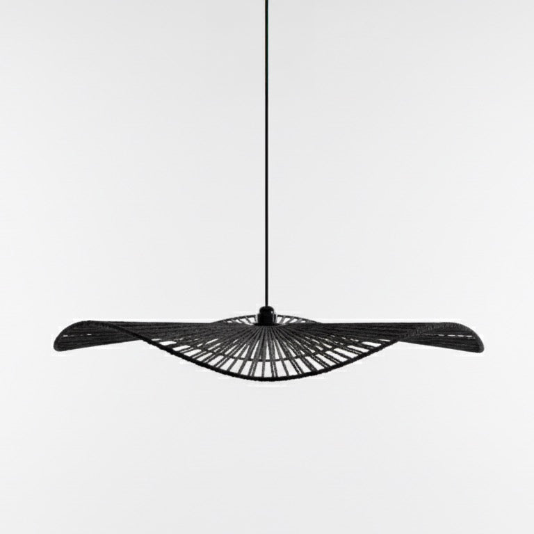 Lámpara colgante de diseño moderno elaborada con estructura tejida en fibra natural teñida de negro. Su forma ondulada crea un efecto visual ligero y elegante, permitiendo que la luz se difunda de manera cálida y acogedora. Ideal para realzar espacios contemporáneos, comedores o salas de estar con un toque artesanal y sofisticado.