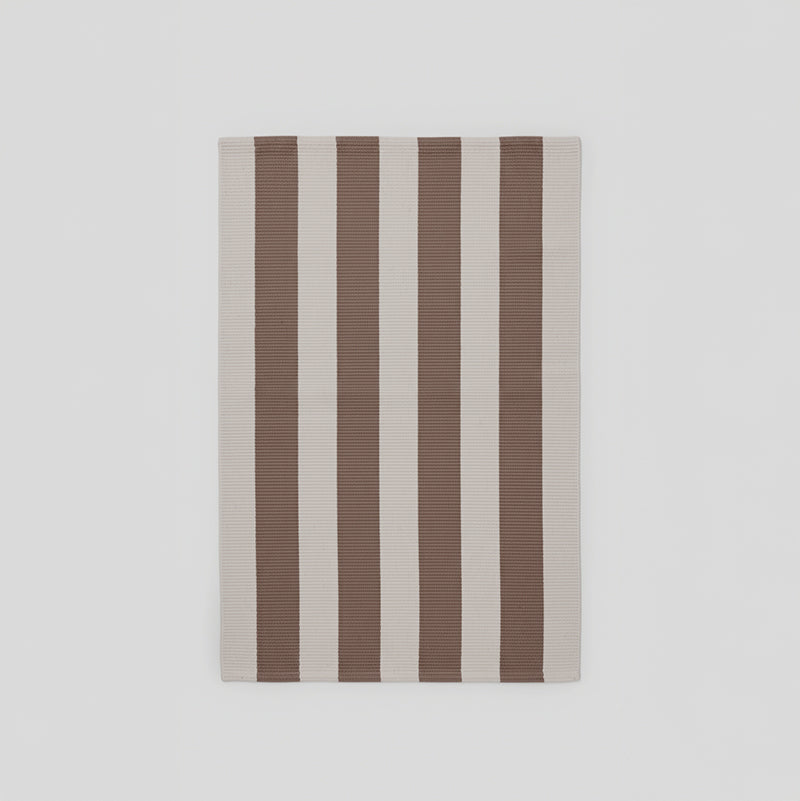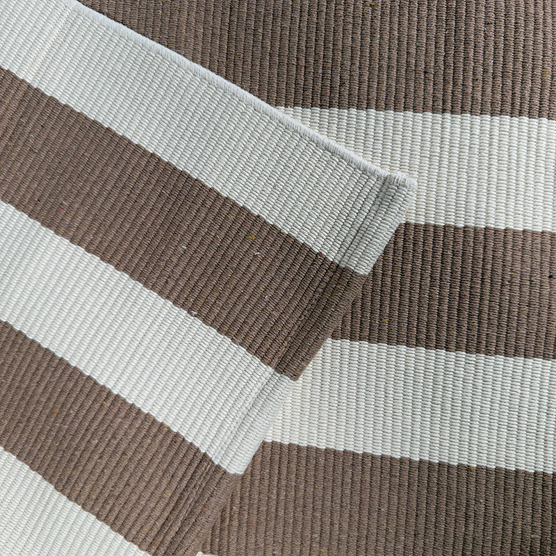 Alfombra de diseño a rayas en tonos arena y blanco que aporta calidez y estilo a cualquier espacio.