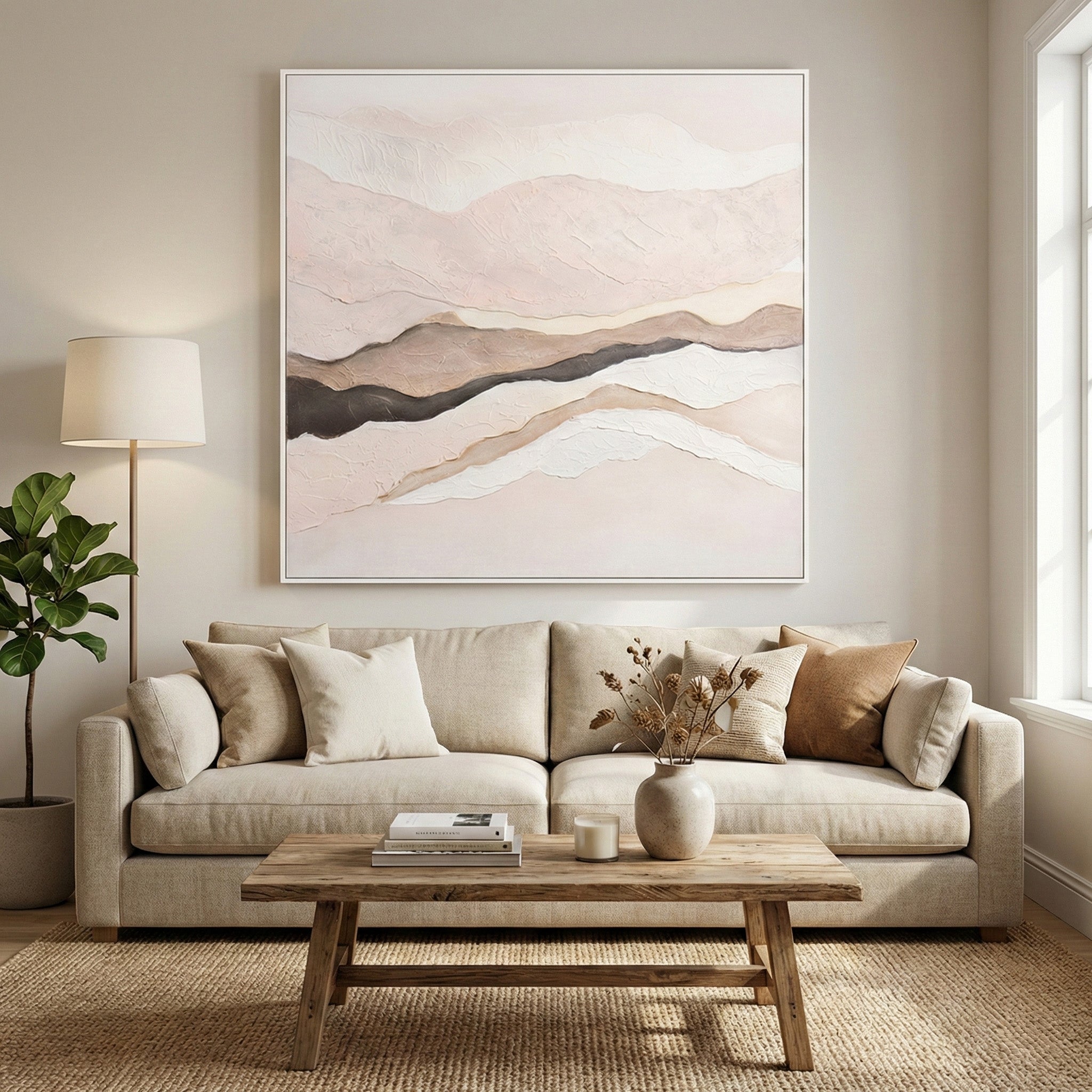 Evoca la fuerza y quietud del paisaje natural, donde las capas de color y textura se entrelazan como huellas del tiempo. Sus tonos arena, beige y terracota recuerdan la calidez de la tierra y la armonía de lo orgánico. Una pieza que transmite serenidad y conexión con lo esencial, perfecta para ambientes cálidos y contemporáneos.