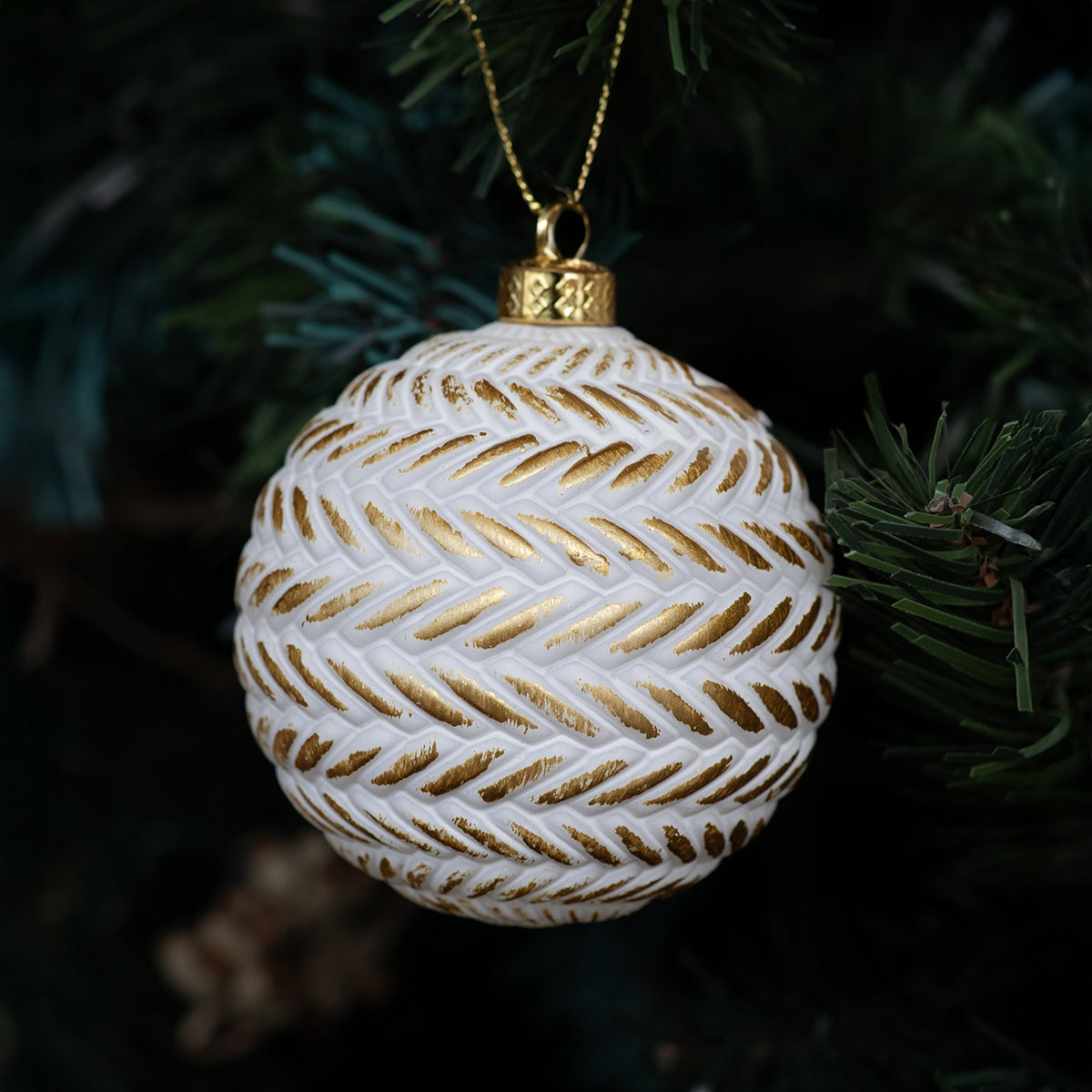 Esfera decorativa con diseño elegante y detalles cuidadosamente trabajados, perfecta para dar un toque festivo, armonioso y sofisticado a la decoración navideña.