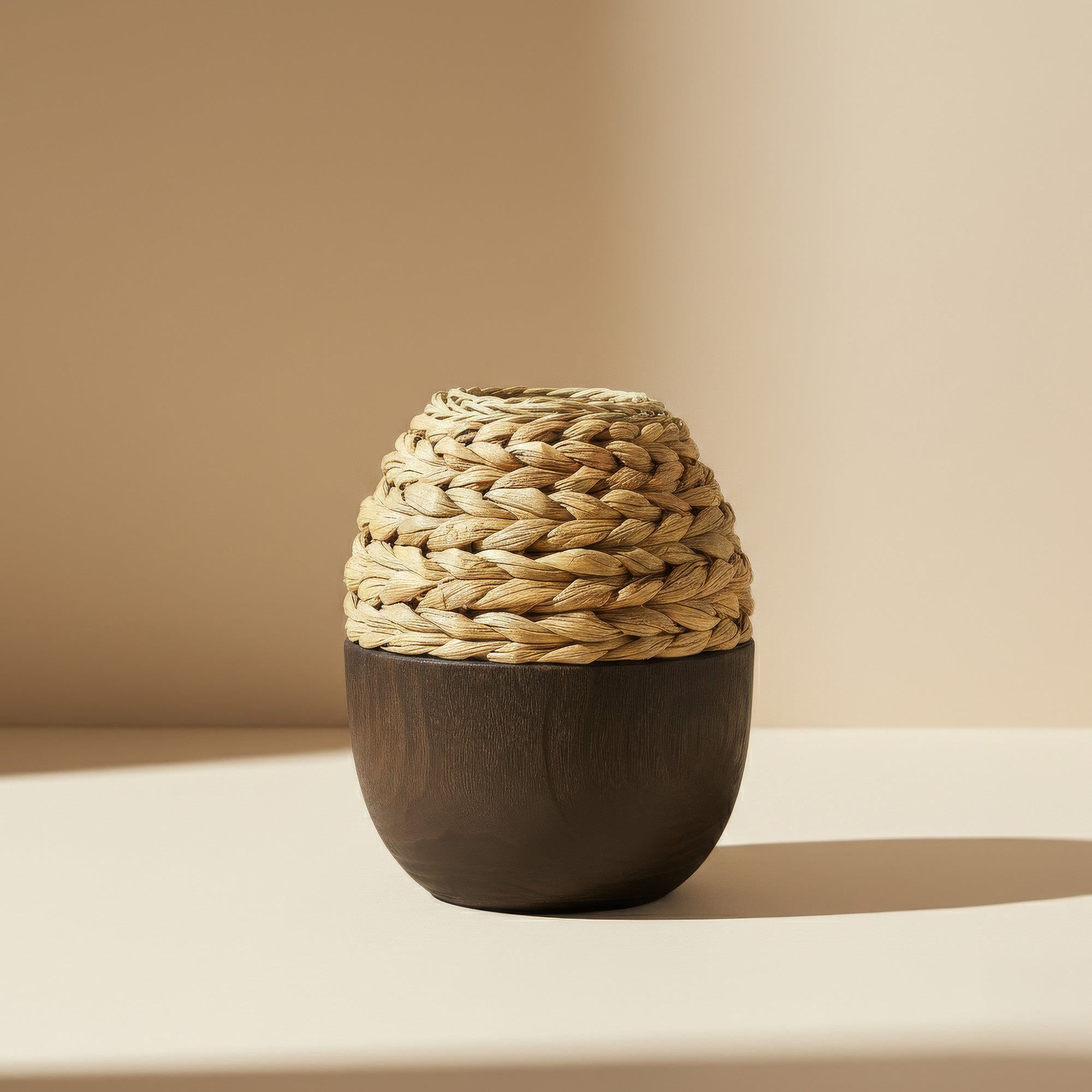 Macetero decorativo que combina texturas naturales para un ambiente cálido y acogedor.