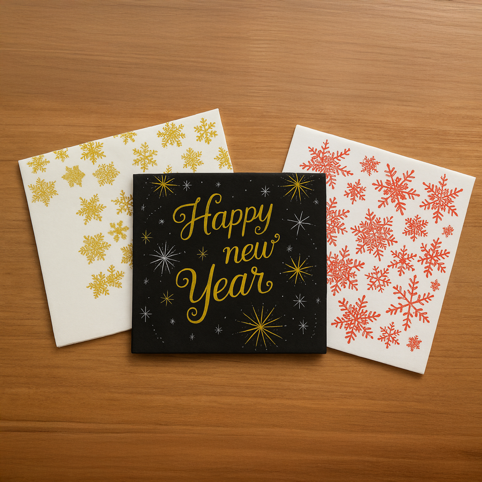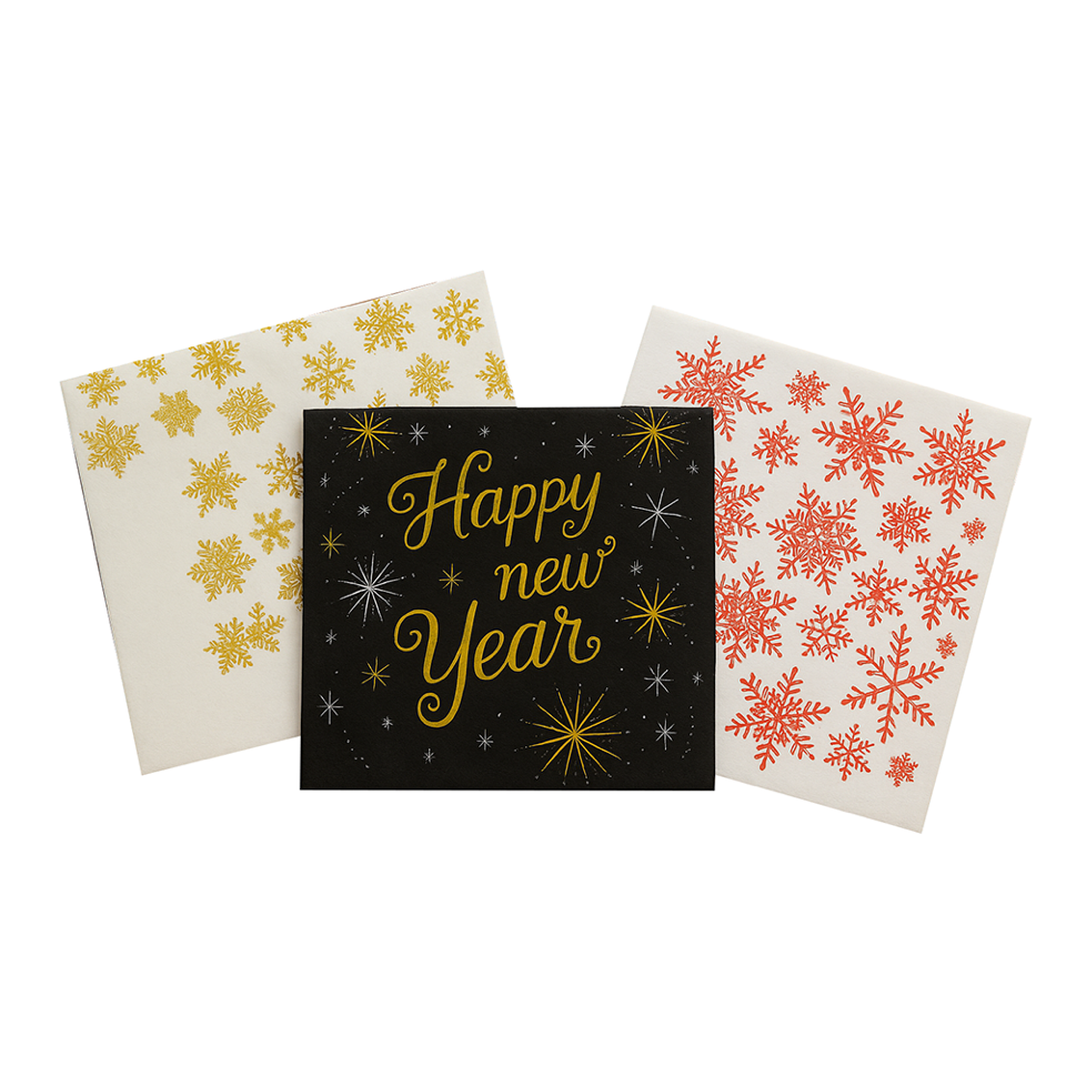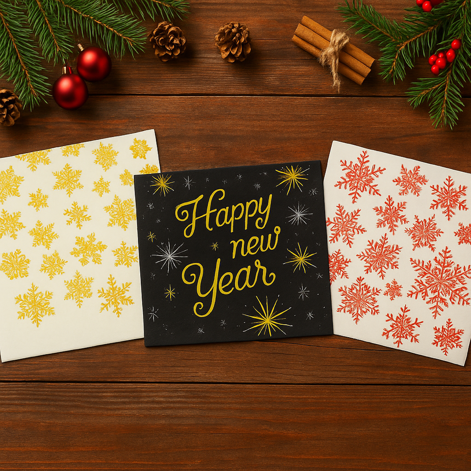Set de 3 paquetes de servilletas con alegres diseños navideños y de Año Nuevo. Ideales para decorar tu mesa en las celebraciones de fin de año, aportando un toque festivo y acogedor. Perfectas para complementar cenas, brindis o reuniones familiares con estilo y espíritu festivo.