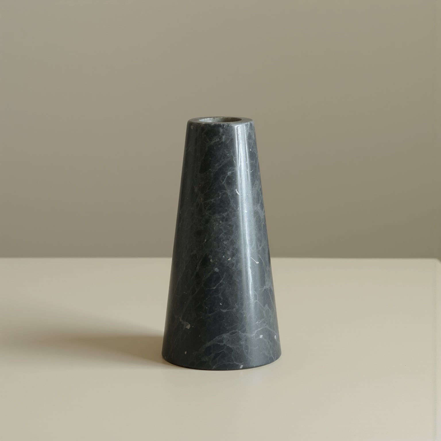 Porta vela con diseño cónico y acabado tipo mármol arena, ideal para aportar un toque elegante y cálido a la decoración. Perfecto para crear ambientes acogedores en cualquier espacio.